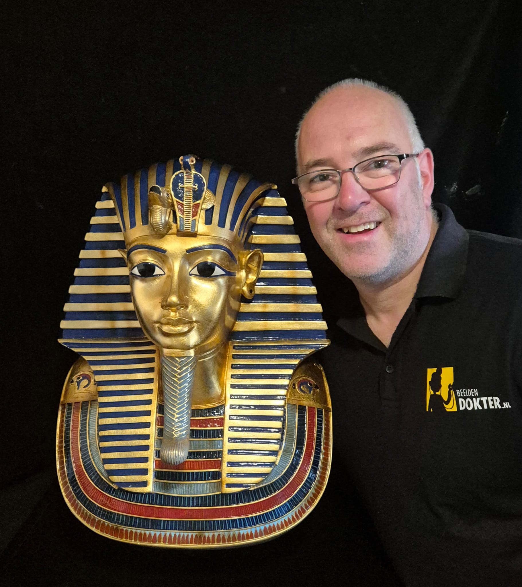 Custom lifesize Toetanchamon museumbeeld professioneel gerestaureerd. De restauratie bestond uit kleurherstel en een gedeeltelijke repaint, met speciale aandacht voor de kraag, waarvan de kleuren weer diepte en levendigheid hebben gekregen. Perfect voor museale presentatie of collectie.